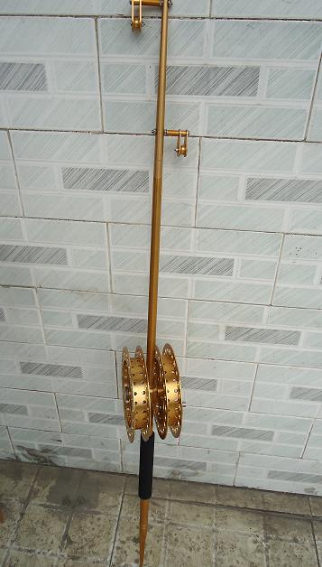 5、在主線上粘有膠布印記的地方(即掛過誘餌小袋的地方)掛上有釣餌的口線, 隨主線送到喂窩處垂釣。 6發(fā)現(xiàn)浮子被子拖入水中時,握著手柄將繞線器用力往上一抬,主線牽動釣線移 位,魚兒便上鉤了,再搖動繞線器,將魚兒收回岸邊摘下。 三、過 河 釣 技 巧 (一)、單線雙放 1左線輪。一般設定安裝主放線,應在上方。在牽線過河時,將左線輪的主 線拉出一小部分穿過抬竿的左上滑輪后,再由上向下穿過背竿滑輪,將線頭上打一個 稍微比上滑輪大點的小圈掛在抬竿的右上滑輪上,**實現(xiàn)了單線雙放的設置。這時, 你拉動主竿或背竿,用姆指輕輕壓住線輪外緣,**可輕松實現(xiàn)一線雙放的功能; 2右線輪。一般安裝主釣線,用于懸掛仕掛牌,應在下方。當背竿拉到對岸 適當位置時,將主釣線穿過右上滑輪后與主放線進行雙線連接,適當松緊雙線,**完 成了主線的架設。 四、抬釣各部件之標準名稱(如圖)